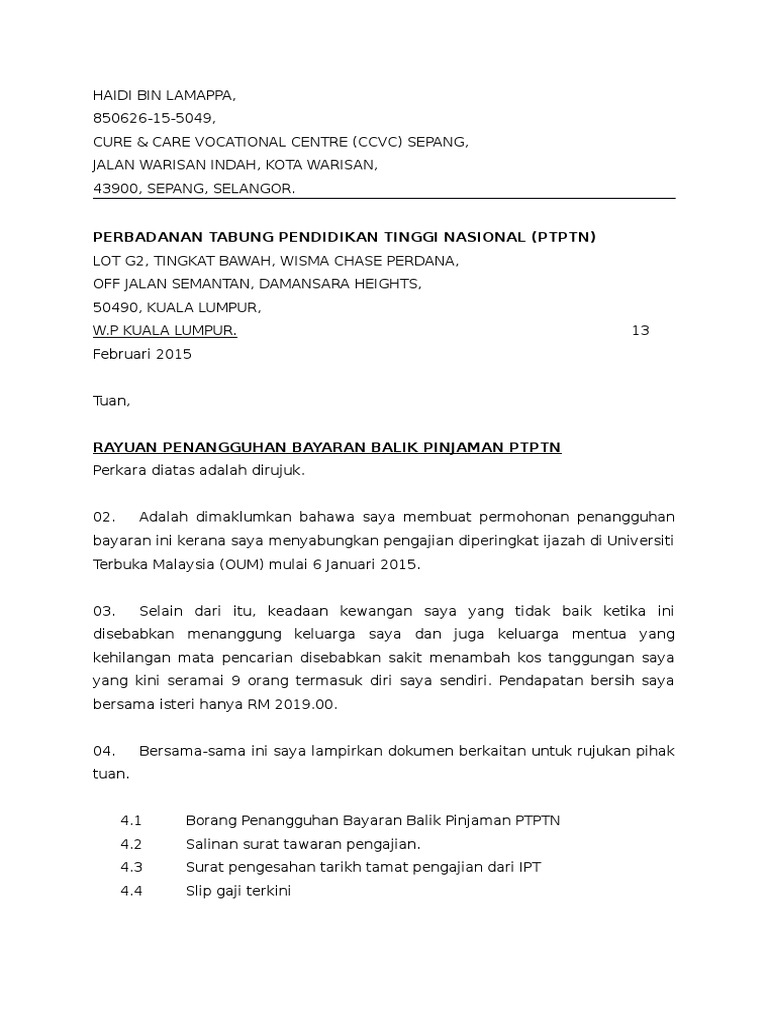 Surat Rayuan Pengurangan Bayaran Ptptn Pdf